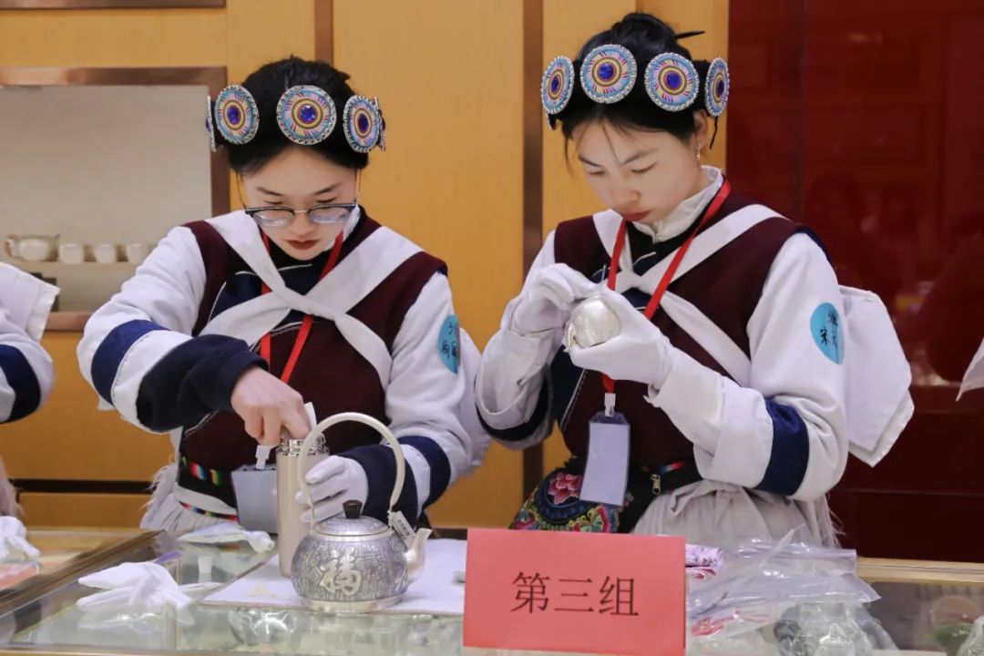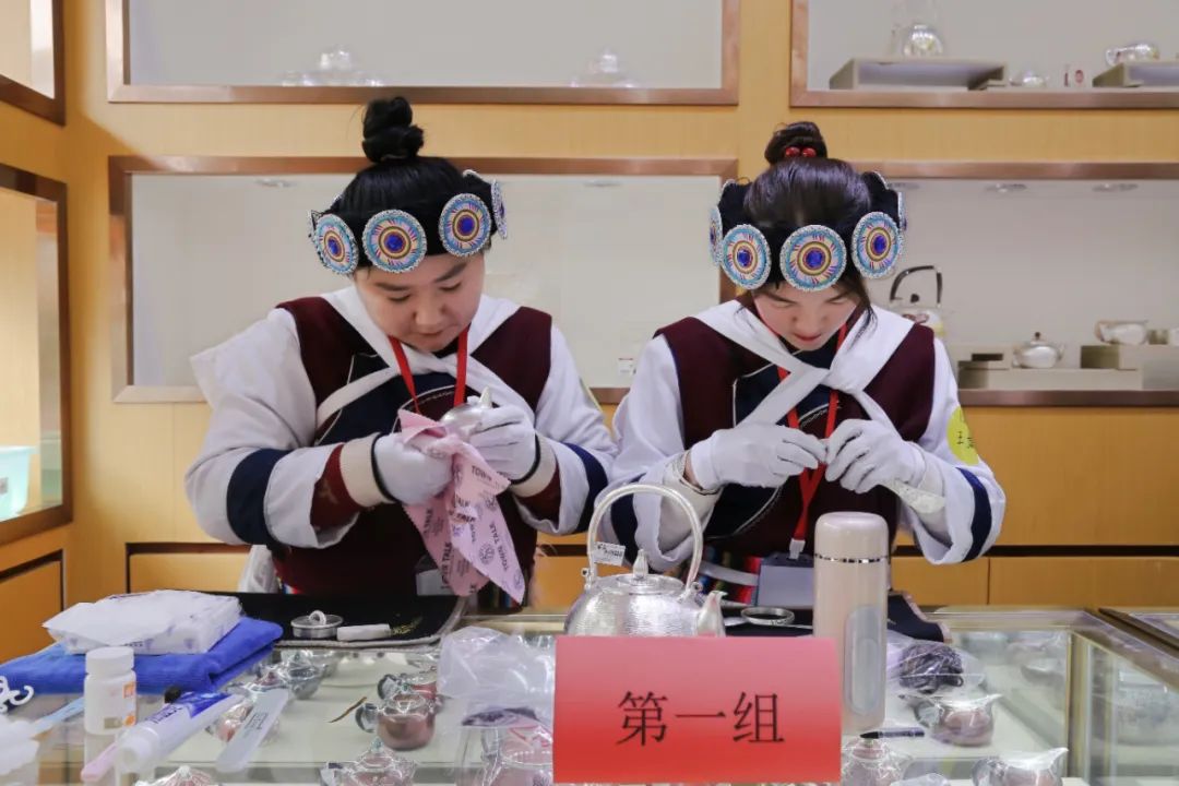 银壶、茶漏、茶架、编绳、保鲜膜等准备到位,选手们摩拳擦掌,迫不及待想要展示精湛手艺。虽然比赛的内容她们每天都在接触,可能在工作中已经重复过百次甚至千次。但短暂的时间限制,他们能完美完成吗?