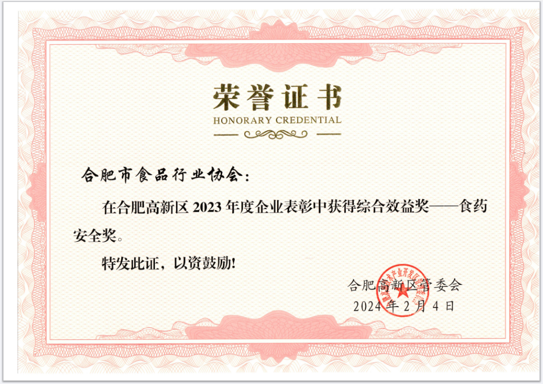 近日,合肥高新区管委会办公室发布《关于表彰合肥高新区2023年度优秀企业及个人的决定》,对过去一年为高新区经济社会发展作出突出贡献的优秀企业和个人进行表彰。共颁发“经济效益、招商引资、示范引领、科创金融、资质荣誉、综合效益”等6大类24个奖项,合肥市食品行业协会荣获综合效益奖——食药安全奖。