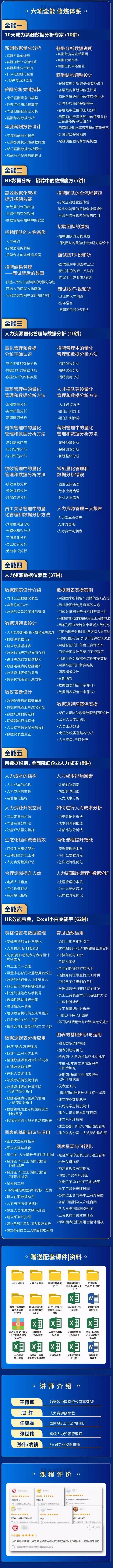 但懂数据分析优化、成本管控、人效分析且会实操的HR却意外成为老板青睐的对象,不惜花高薪去聘请,因为他们可以给企业带来更直观的价值输出。从阿里巴巴的官网发布的P8~P9级人力资源的招聘JD就可以看出:无论是岗位要求还是任职资格,都明确要求候选人具备数据分析的能力、能够形成数据看板。要知道字节P8~P9的薪资都是百万级别的,所以HR的待遇越优厚,对数据分析能力的要求就越高,这已然成为一个不争的事实了。那么如何才能让我们HR具有高价值呢?那就是要求HR除了掌握六大模块的知识外,具备新的技能——数据分析能力!不止字节和阿里,华为也专门设立了人力资源数据分析师的岗位。除了阿里、字节、华为、谷歌对 HR 有数据方面的要求,目前几乎所有企业都对数据有要求,更是开出月薪30k+的高薪招这类人才。所以具备数据分析能力,在未来将是对HR的普遍要求。不会数据分析的HR,必将没有市场。很多HR朋友吐槽工作越来越难做了,不知什么时候起,HR的招聘JD上都出现这样一句话:支持各部门数据需求,进行数据分析,完成策略性支持工作....因为在数据时代,人力资源管理逐渐脱离了传统的管理模式,走向了数据化和智能化。如果HR们在人力资源数据化管理中,没有认知和方法,是很难在工作中做到高效的。所以用数据说话,慢慢也成了HR日常工作的准则之一!但是,小编通过调研得知当前HR们对人力资源数据分析存在以下两个重大问题:没有分析的数字罗列就没有灵魂,并不能对HR工作乃至公司的业务发展产生实际的推动作用,这样的数据分析不要也罢。老板们恐怕也不会愿意对着一组组数字猜它们背后的意义!2、数据分析脱离了公司业务,不能直接或间接的带来实际效益。所有的数据分析,都应该有驱动业务的价值。人力资源的数据分析,应该是通过数据获取有关组织和人才的信息,对企业在组织和人才上未来可能产生的问题进行预测、预警、预判,并据此向业务部门提出决策建议。一张好的图表真的可以做到一图胜千言!真正的数据分析是要通过数据分析,找到问题,形成方案,采取行动,反馈评估,这样的一个闭环的过程。而现实是很多HR的数据分析还停留在最初的水平,不能发挥出工作应有的价值。HR如何才能掌握数据分析能力,推动业务部门的发展,征服老板呢?MeetHR特别推出了线上系列课《高薪HR数据分析师》,手把手教你人力资源数据分析!都是HR必备的实用资料,太多了,就不一一展示了......广告声明:本文系MeetHR自有课程&资料广告,对内容真实性负责)