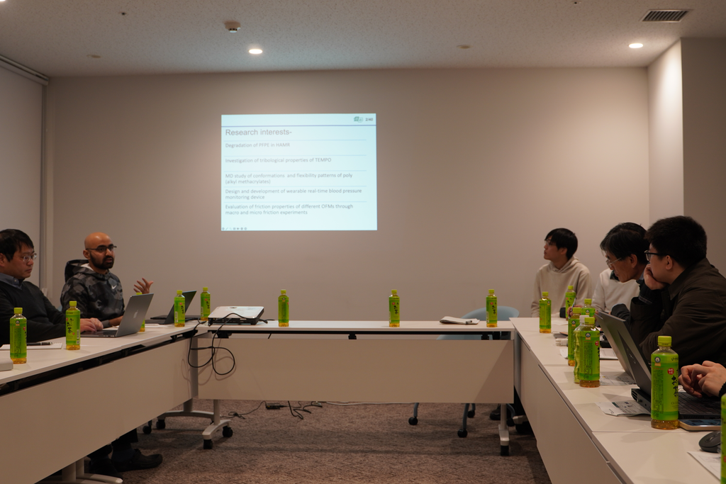 会议伊始,张贺东实验室助理教授Himanshu Shekhar对实验室内在长时间、大规模摩擦学现象的计算机模拟方法、纳米液体润滑膜摩擦学特性的试验评价技术、纳米润滑膜图形细微化及其作用机理,以及纳米润滑膜图形设计等方面的研究进行了详细的介绍。