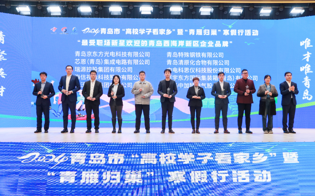 青雁归巢乘风来,筑梦新区献青春。为贯彻党的二十大精神,全面落实关于高校毕业生就业、青年人才工作的决策部署,加快推进新时代“人才强青”计划,同时充分发挥先进典型示范带动作用,2024年2月5日,青岛西海岸新区人社局组织“高校学子看家乡”暨“青雁归巢”寒假行活动,并举办“最受职场新星欢迎的青岛西海岸新区企业品牌”颁奖仪式。瑞源控股集团作为获奖单位受邀参加。