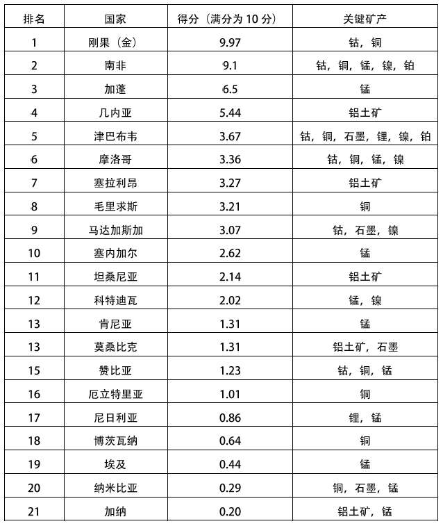 这份排名得分综合了两个指标:2017-2021年间8种关键矿产(铝土矿、钴、铜、石墨、锂、锰、镍和铂)生产的市场份额变化,以及同期自然资源收入的变化。我们对这两个指标进行了加权,前者占最终得分的67%,后者占33%。此外,只有在所评估的8种关键矿产中至少生产一种关键矿产的国家才会进行排名。