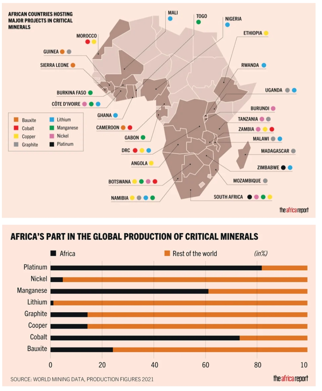 非洲矿产尚未开发的潜力非常巨大。据美国战略与国际问题研究中心(CSIS)估计,非洲大陆拥有85%的锰储量、80%的铂和铬储量、47%的钴储量以及21%的石墨储量。