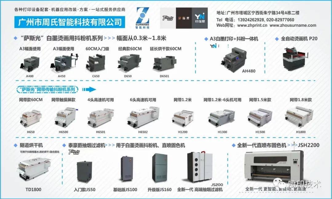 广州市周氏智能科技有限公司主要产品有:萨斯光白墨烫画抖粉机、打印抖粉一体机、写真机喷绘机烘干器、旗帜布料发色机、抽烟过滤机、收放纸器、千米薄纸收卷机、万米材料收卷机、各类写真UV连供墨盒,同时可按客户需求设计和生产配套设备。