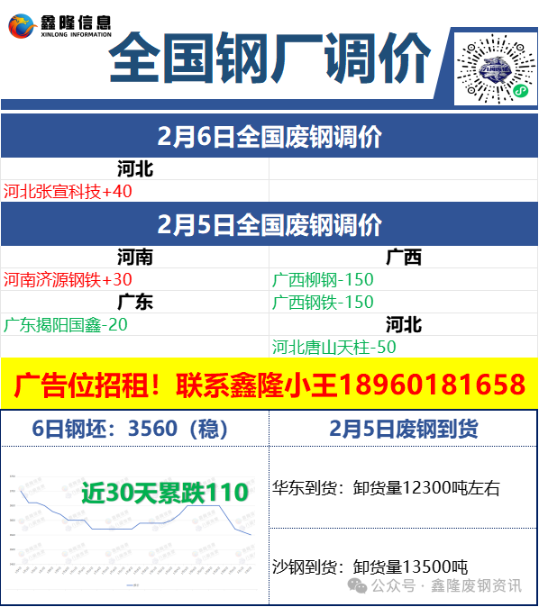 【鑫隆资讯】2月6日河北张宣科技挂牌价格统一上调40,最新接货价:重废2900-2930中型2860小型2775,轻料2410破碎用毛料废钢2380-2710,废钢破碎料2600-2790,不含税