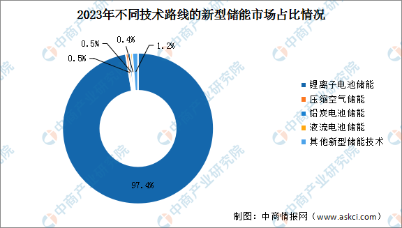 近年来,新型储能新技术不断涌现,技术路线“百花齐放”。锂离子电池储能仍占绝对主导地位,压缩空气储能、液流电池储能、飞轮储能等技术也在快速发展。截至2023年底,已投运锂离子电池储能占比97.4%,压缩空气储能占比0.5%,铅炭电池储能占比0.5%,液流电池储能占比0.4%,其他新型储能技术占比1.2%。