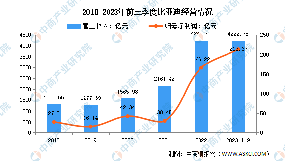 2023年前三季度实现营业收入4222.75亿元,同比增长57.75%;实现归母净利润213.67亿元,同比增长129.48%。2022年比亚迪汽车、汽车相关产品及其他产品营收占整体的76.57%,手机部件、组装及其他产品营收占整体的23.30%。