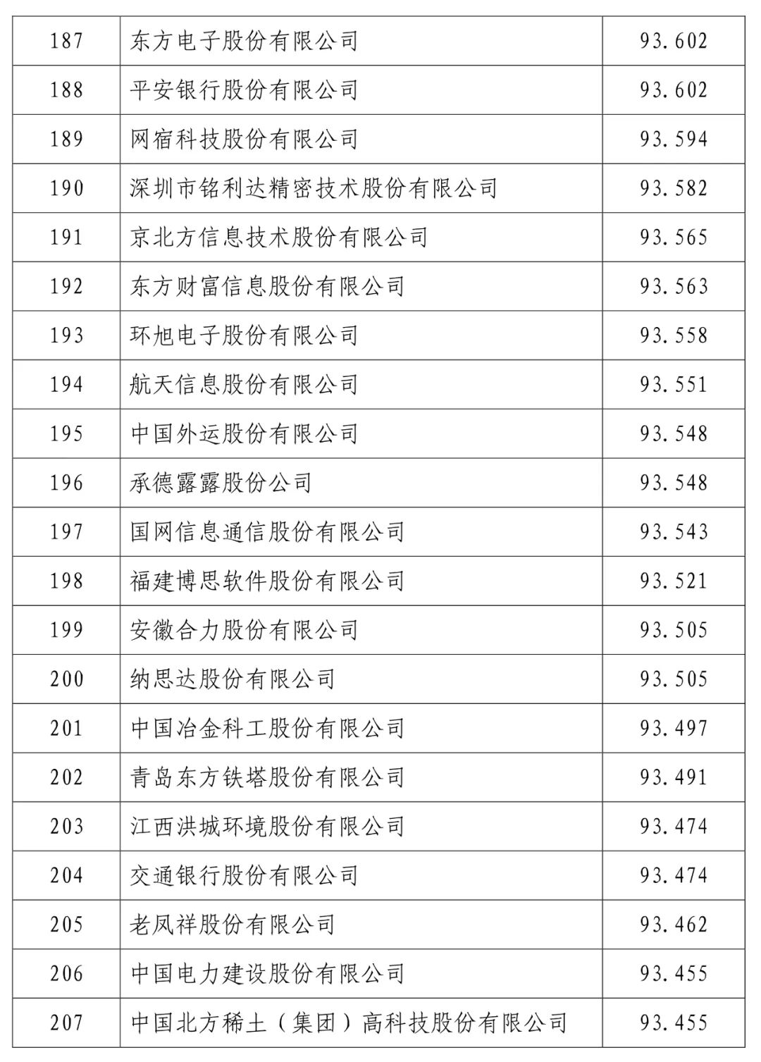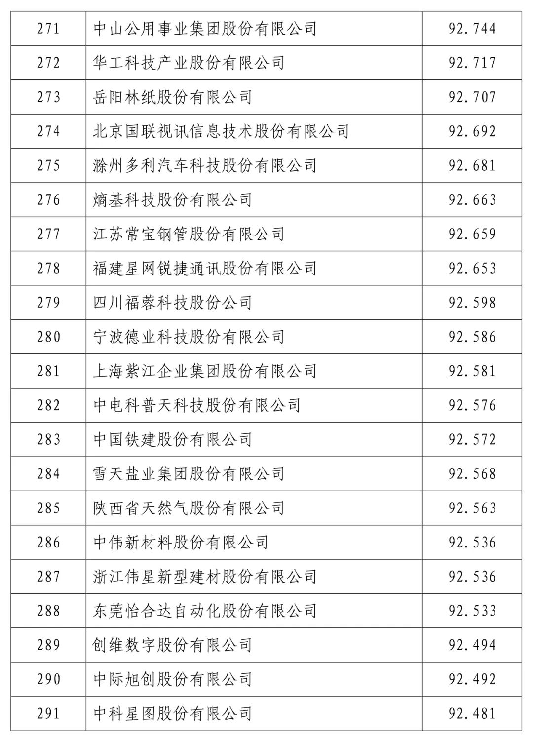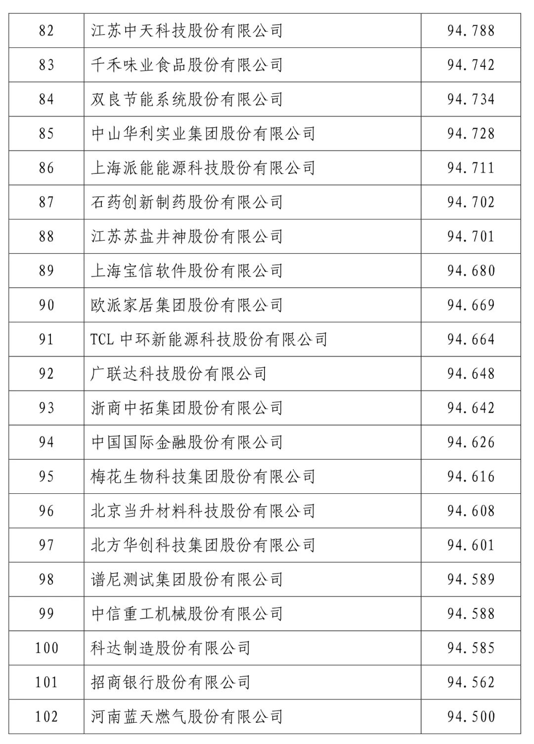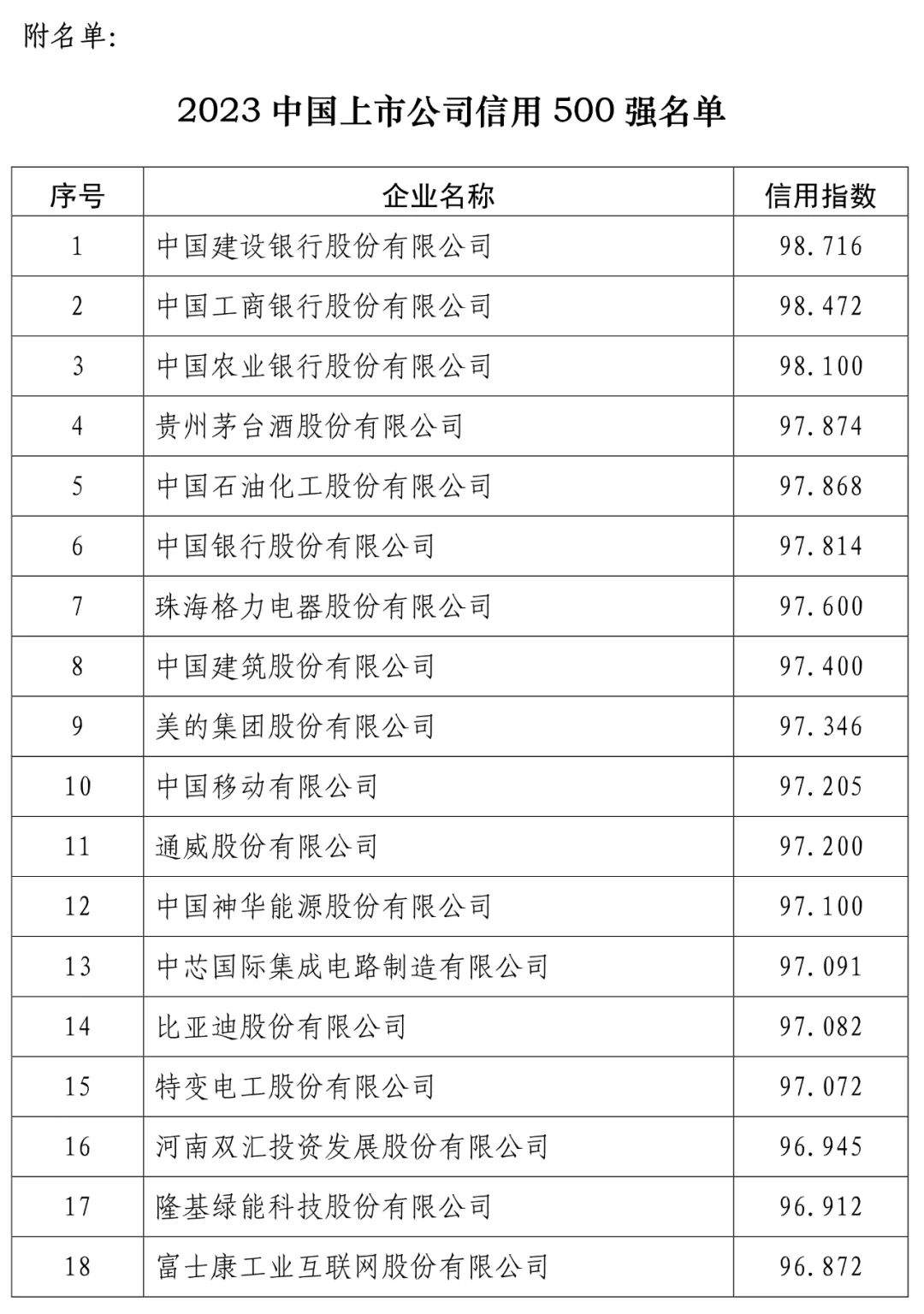 中国建设银行股份有限公司(信用指数:98.716)位列2023中国上市公司信用500强榜首,中国工商银行股份有限公司(信用指数:98.472)、中国农业银行股份有限公司(信用指数:98.100)、贵州茅台酒股份有限公司(信用指数:97.874)、中国石油化工股份有限公司(信用指数:97.868)、中国银行股份有限公司(信用指数:97.814)、珠海格力电器股份有限公司(信用指数:97.600)、中国建筑股份有限公司(信用指数:97.400)、美的集团股份有限公司(信用指数:97.346)、中国移动有限公司(信用指数:97.205)进入前10名。