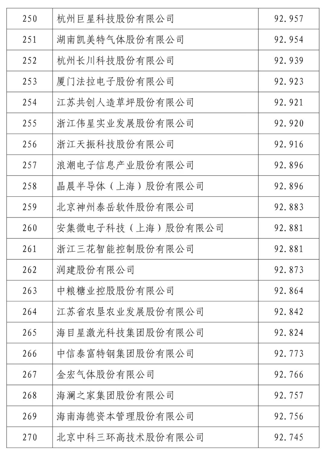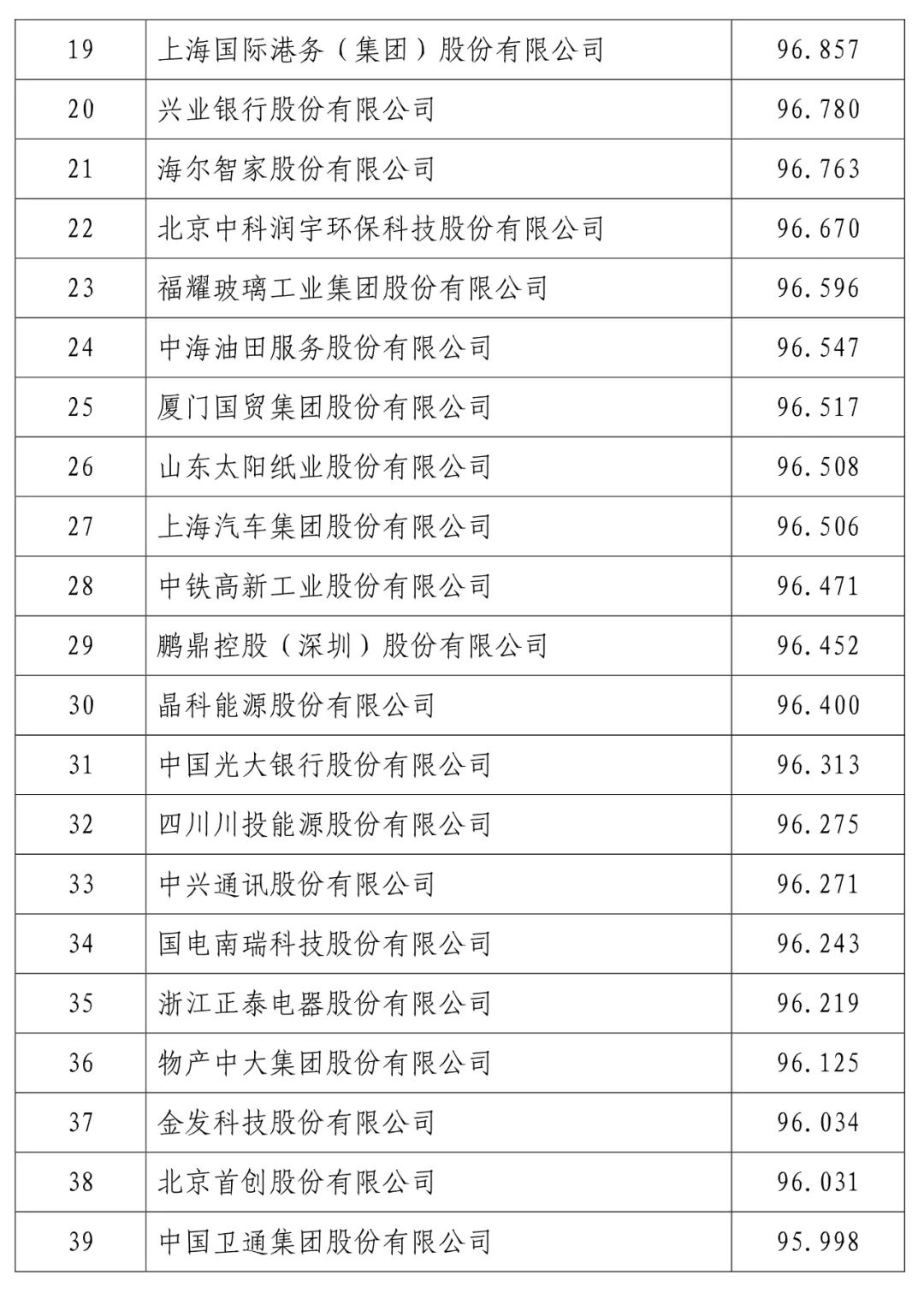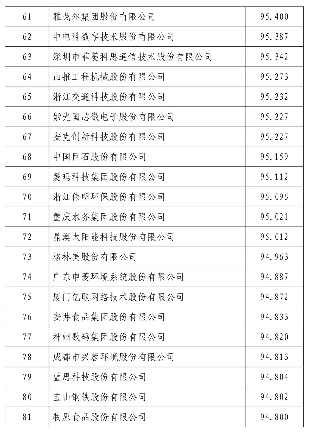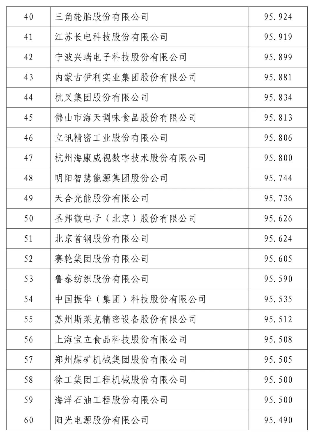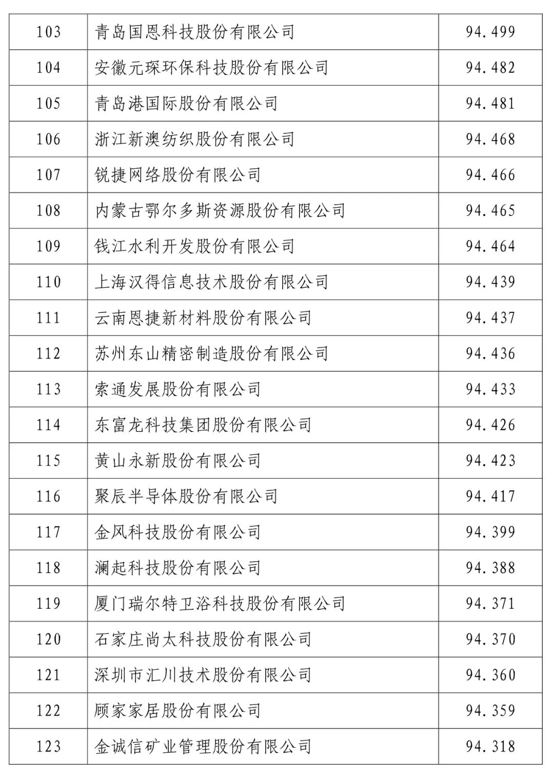 中国建设银行股份有限公司(信用指数:98.716)位列2023中国上市公司信用500强榜首,中国工商银行股份有限公司(信用指数:98.472)、中国农业银行股份有限公司(信用指数:98.100)、贵州茅台酒股份有限公司(信用指数:97.874)、中国石油化工股份有限公司(信用指数:97.868)、中国银行股份有限公司(信用指数:97.814)、珠海格力电器股份有限公司(信用指数:97.600)、中国建筑股份有限公司(信用指数:97.400)、美的集团股份有限公司(信用指数:97.346)、中国移动有限公司(信用指数:97.205)进入前10名。