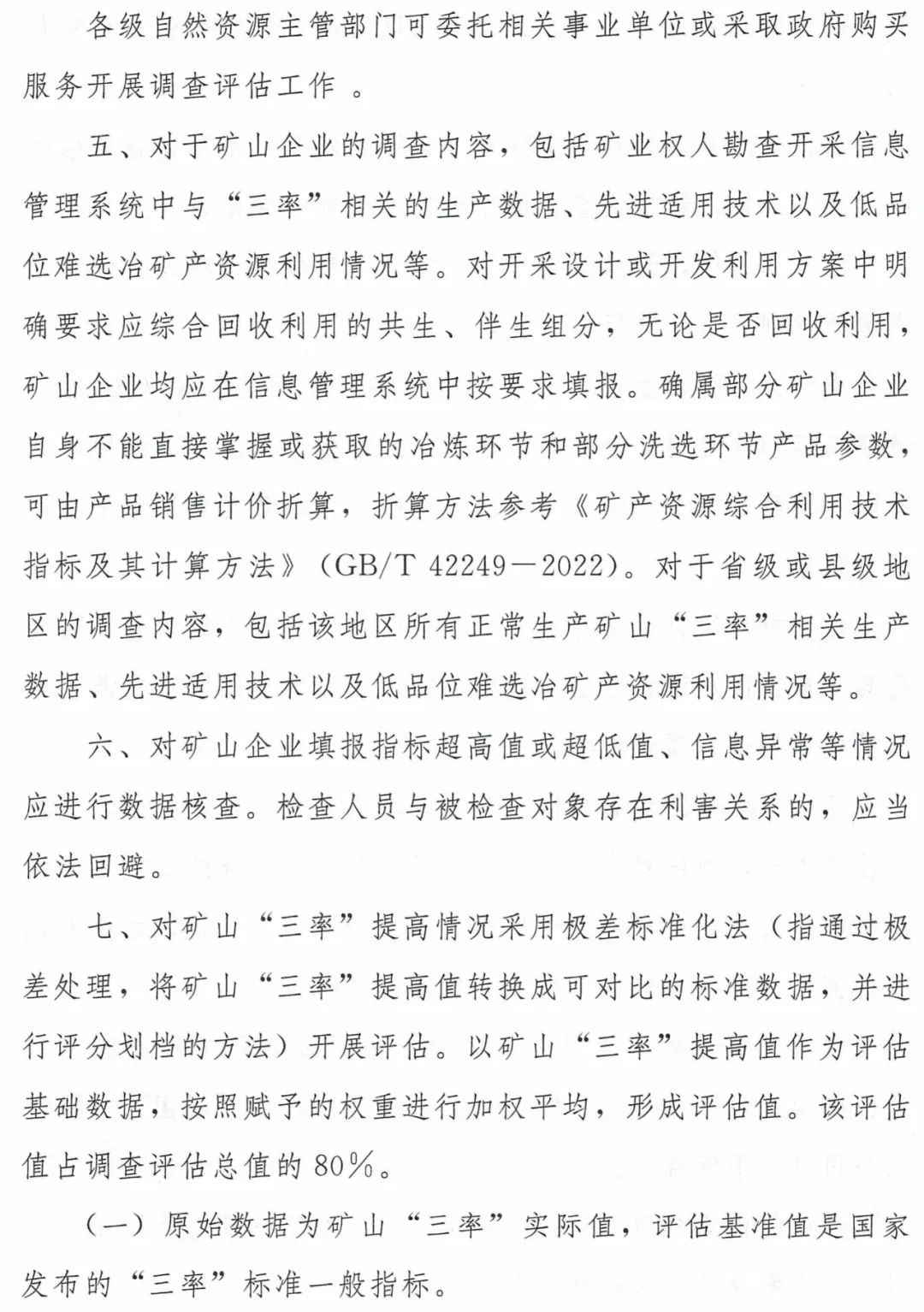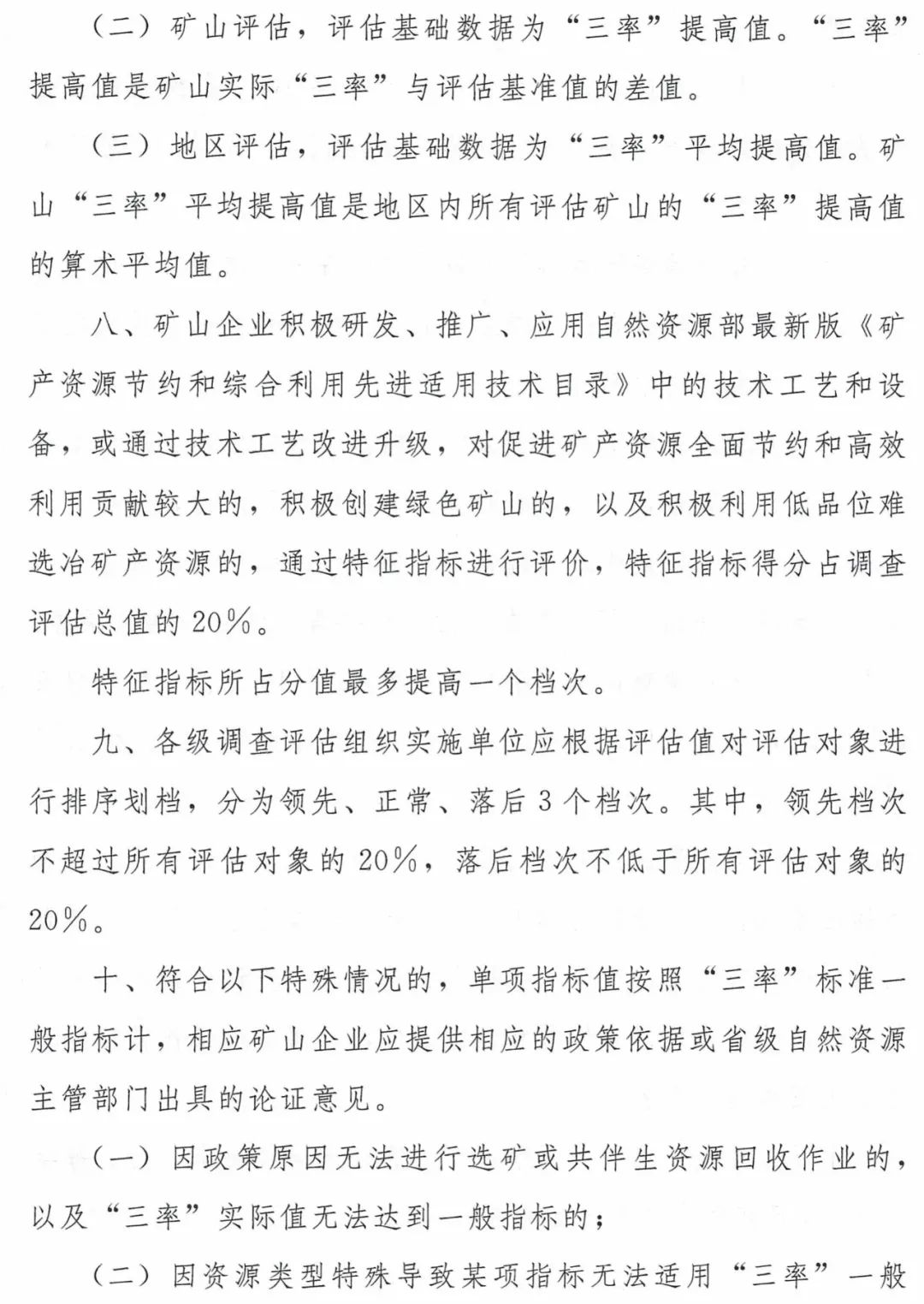 为了保证排序划档的科学性和准确性,《办法》明确在“三率”等数据调查基础上,以矿山“三率”提高值(即矿山“三率”实际值与国家发布的“三率”一般标准之差)作为评估基础数据,釆用极差标准化法开展评估。这种方法可以消除不同矿种的差异,将不同矿山“三率”转换成可对比的标准数据,方便开展排序划档。需要说明的是,“三率”指标占调查评估总值的80%。为综合评价矿产资源开发利用水平,可以通过对矿山企业研发推广先进适用技术、创建绿色矿山以及积极利用低品位难选冶矿产资源等有关情况通过特征指标进行评价,特征指标得分占调查评估总值的20%。