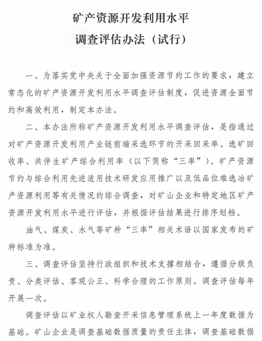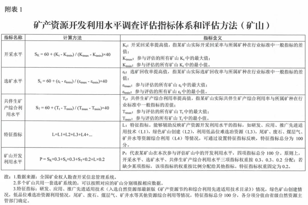 附件矿产资源开发利用水平调查评估办法(试行)。对调查评估的工作内涵、职责分工、调查对象、调查内容、评估指标、评估方法、成果上报、时间进度等方面提出明确具体要求。