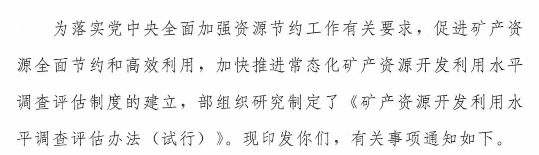 2015年,中共中央、国务院印发的《生态文明体制改革总体方案》(中发〔2015〕25号)要求:“建立矿产资源开发利用水平调查评估制度”。2016年,原国土资源部会同其他部委联合印发了《矿产资源开发利用水平调查评估制度工作方案》,提出“2020年建成调查评估制度”的总体目标。2022年12月13日,中共中央办公厅、国务院办公厅印发《关于全面加强资源节约工作的意见》(中办发〔2022〕67号),进一步强调了“建立常态化的矿产资源开发利用调查评估制度”的要求。