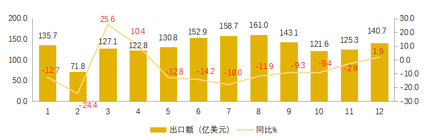 1-12月,东部“五省一市“出口均呈下降态势,中西部出口省市出口占比提升。浙江、广东、江苏、山东、福建、上海出口同比分别下降3.2%、16.9%、16.1%、7.9%、15.4%和12.1%,合计占全国比重为73.7%,同比减少2.5个百分点。中西部20省市出口合计增长5.9%,占总出口比重为22.3%,占比增加2.9个百分点。其中,新疆、湖北、广西、四川分别大增23.6%、32.1%、17%、60.2%。