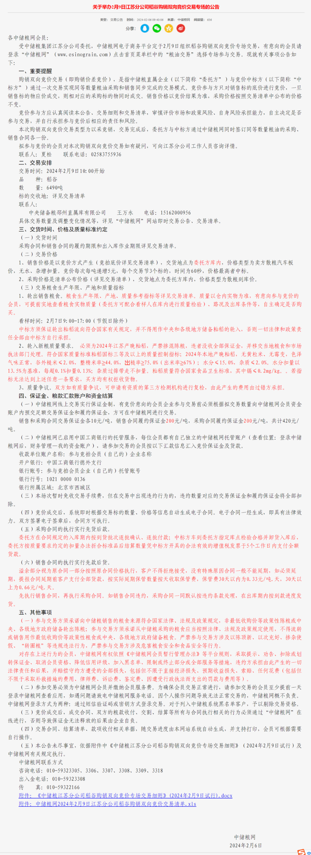 关于举办2月9日江苏分公司稻谷购销双向竞价交易专场的公告