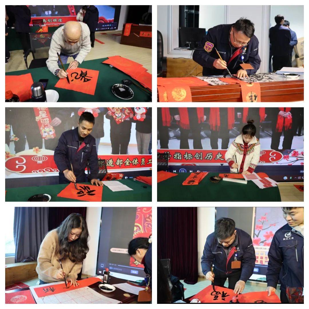 舞台上,只见职工嘉宾现场泼墨,行云流水,落笔如云烟,将真诚的祝福融于笔端,不一会,一幅幅散发着清新墨香的喜庆大红春联、一个个饱含神韵的“福”字就展现在人们面前。闻讯赶来的员工们一边欣赏着这些喜气洋洋的书法作品,开心地讨论着春联的寓意,一边精心地挑选自己心仪的春联。舞台下是猜灯谜活动和年货节现场,在猜灯谜活动中,只见一个个红灯笼上悬挂的一幅幅春节字谜。员工们有的三三两两聚在一起,对着灯谜喜笑颜开,有的紧锁眉头认真思考,兑奖台旁站满了猜出灯谜的员工,大家开心有序地排着队,领取今年猜灯谜的奖品。
