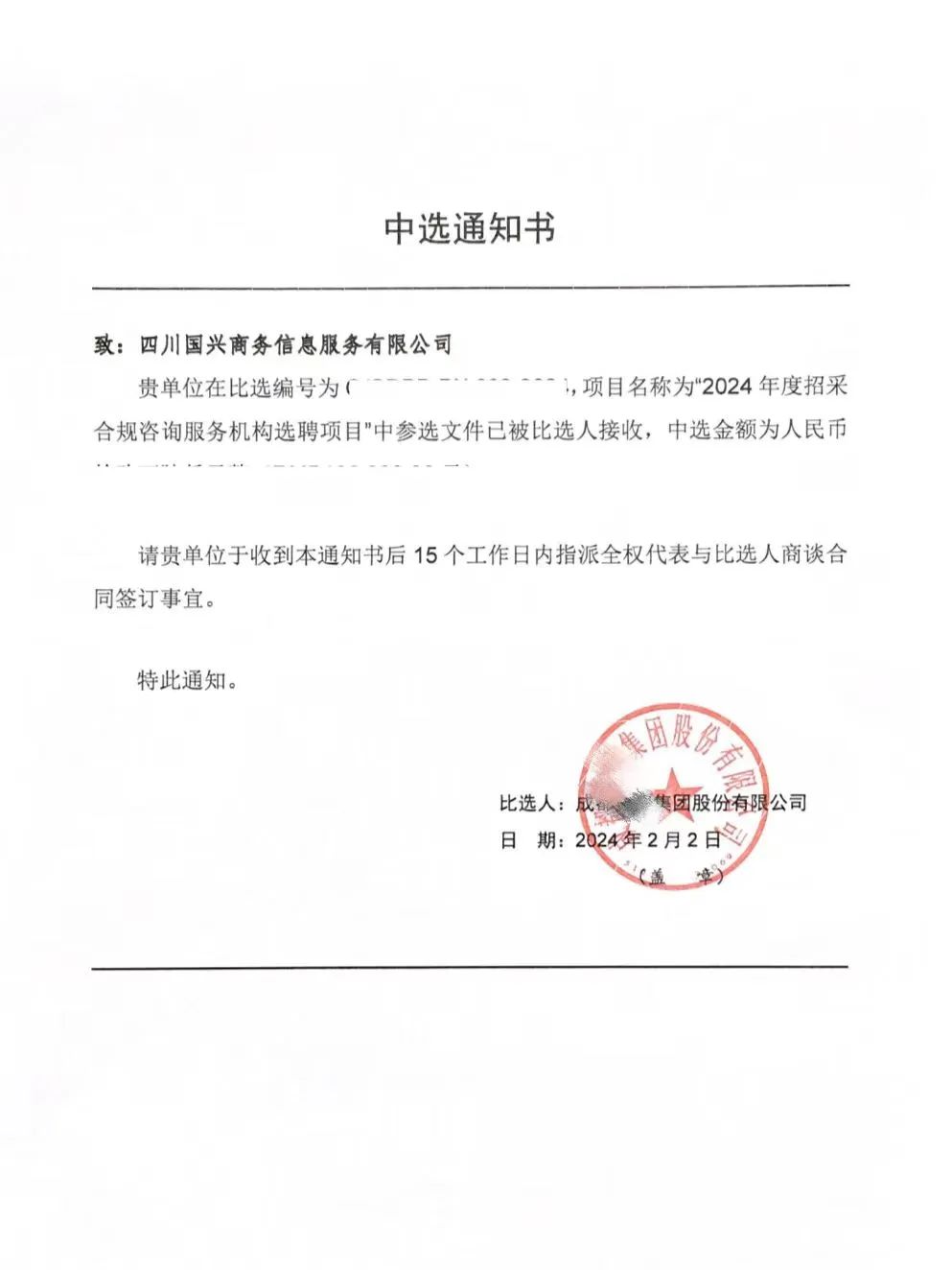 2024年2月,四川天府阳光招标代理有限公司(原四川国兴公司)成功中标“成都某集团2024年度招采合规咨询服务机构选聘项目”。