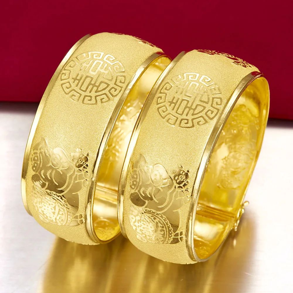 龙凤手镯一般多为黄金,龙凤手镯不仅有长辈馈赠的意思,还蕴含着对一对新人龙凤呈祥、情比金坚的祝福,表达对子女未来生活的美好祝愿。