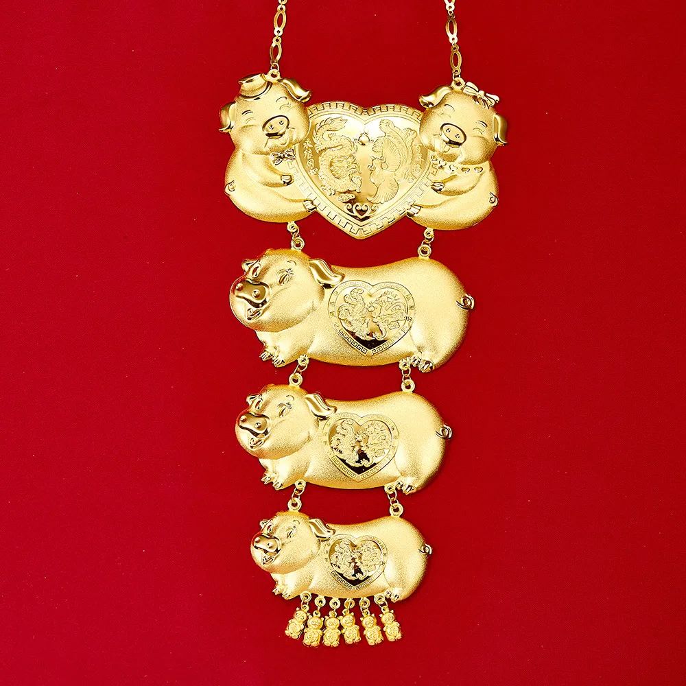 同时,层数还有特别的寓意。金猪一层叠一层,每一层代表一代,如果有四层就代表四代同堂,小猪仔就代表将来的新一代。所以现在已有三代同堂的新人,若要「升级添喜」,最好就买四层,代表很快就四代同堂。新娘戴上之后摸一摸猪头,就代表鸿运当头,摸一摸猪尾,有添福的意思,摸一摸猪仔,就代表早生贵子。