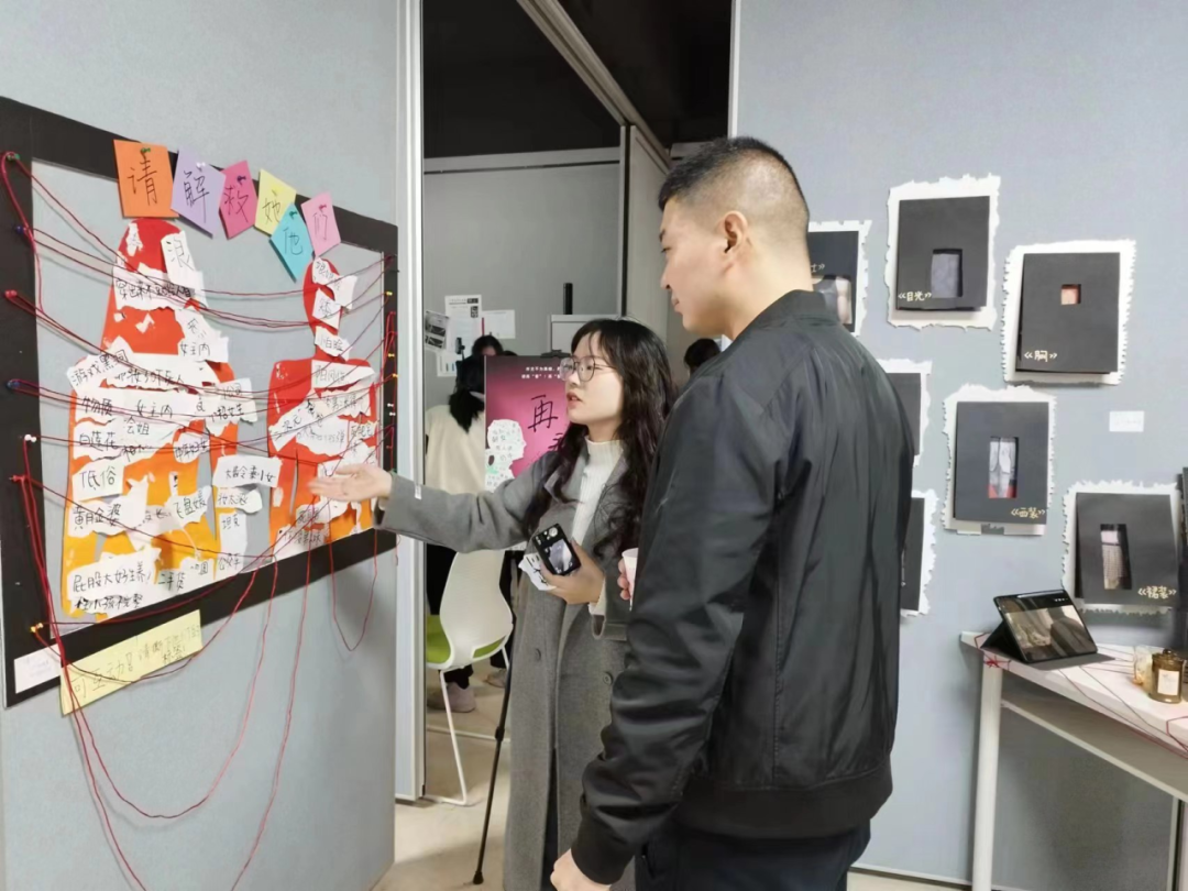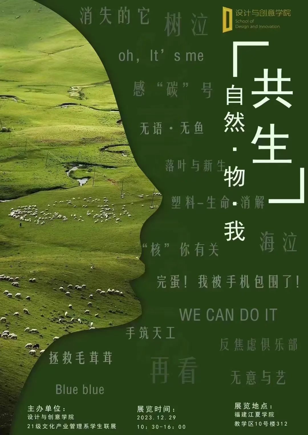 2023年12月29日上午10:30,在课程老师程超、叶思吟的指导下,“共生——自然•物•我”创意展览在教学区10号楼312展厅开展。同学们通过创意巧思将SDGs(Sustainable Development Goals可持续发展理念)融入展览中, 以丰富多样的媒介形式,设计多样沉浸式的观展体验,启发观众对世界不一样的思考。