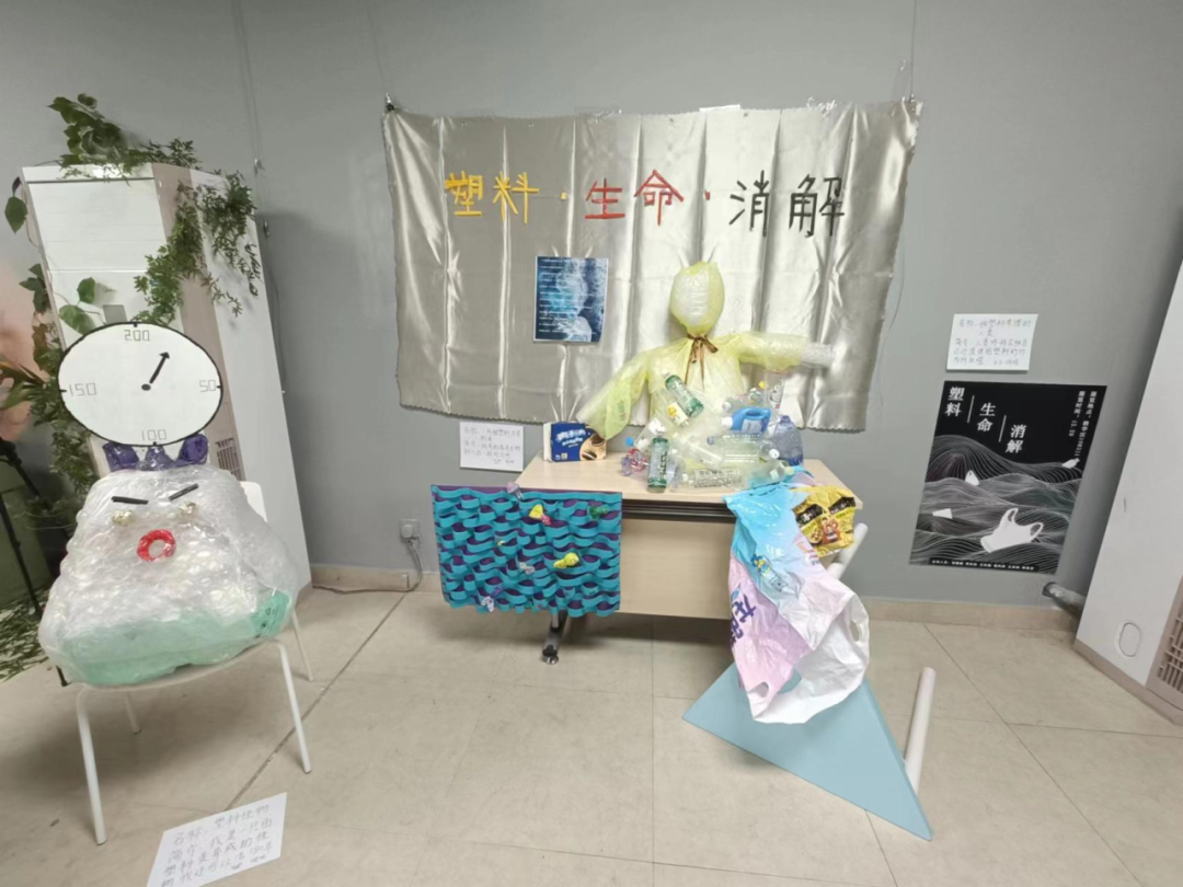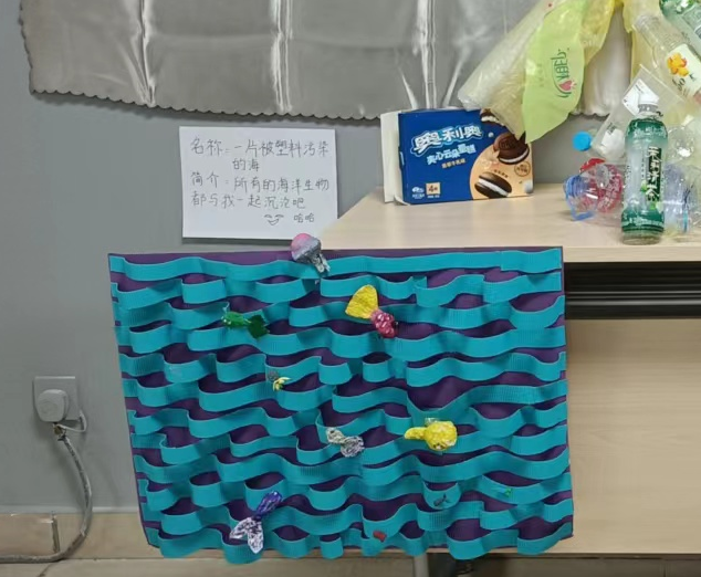 指出一个塑料袋被掩埋在土里,需要两百年才能完全降解,比人的一生还要漫长很久。因此,小组成员通过怪诞、夸张的风格,展现塑料所产生的变异海洋生物、时钟、塑料怪物……提醒参观者更关注白色污染,推广减少塑料使用的环保生活。