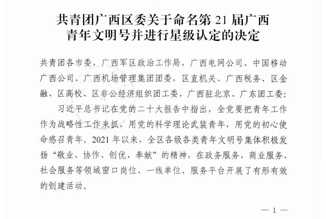 此次命名表彰由共青团广西区委根据《广西青年文明号活动管理办法》规定,经综合考察、择优遴选、组委会审议、社会公示,最终命名在2021-2022年度广西青年文明号创建周期中,符合创建条件且表现突出的443个集体为“第21届广西青年文明号”并将443 个集体全部认定为“一星级广西青年文明号”。