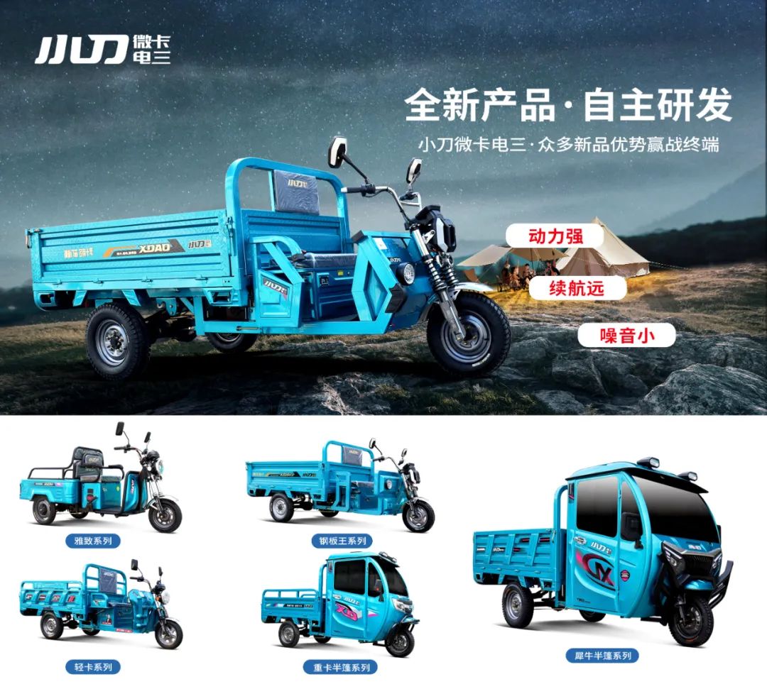 在消费升级时代,要想赢得市场和消费者青睐,坚守匠心做好产品,是亘古不变的真理。作为电三行业的款型王者,小刀微卡始终把“坚持创新做好产品”作为市场竞争的致胜法宝。为打造更高标准、更强品质的国民好三轮,小刀微卡不仅行业独家投入1200万增添智能化、高端化生产设备,更推出了一系列强势新品,包括三开、平板、篷车、休三等市场核心品类,进一步构筑市场差异化壁垒,并以领先的核心技术与产品优势逐渐强化市场主导权。其一、品类制霸,技术领先