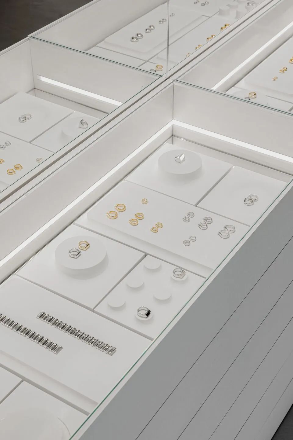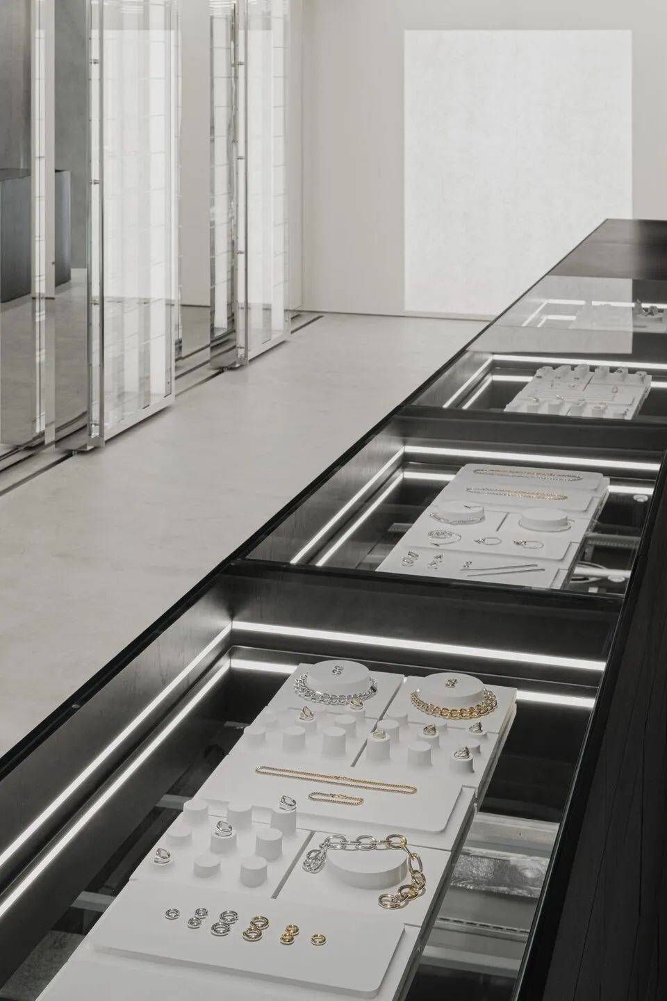 Specific Generic的设计团队在创建这家旗舰店时,注重保留空间的原始美感和孤独感,同时巧妙地融入了高功能的展示单元,用于展示Tom Wood的高端珠宝。耐用材料如铝、钢、玻璃和Kvadrat Really纺织品被广泛使用,这些材料不仅美观,而且环保,可以重复使用和完全循环。此外,店内还配备了由著名工业设计师山本大辅设计的定制家具,进一步提升了店铺的整体品质。