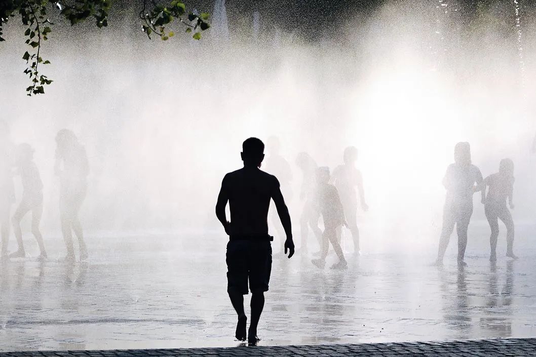 2023 年 7 月 17 日,一名男子走入西班牙马德里的喷泉中解暑 孟