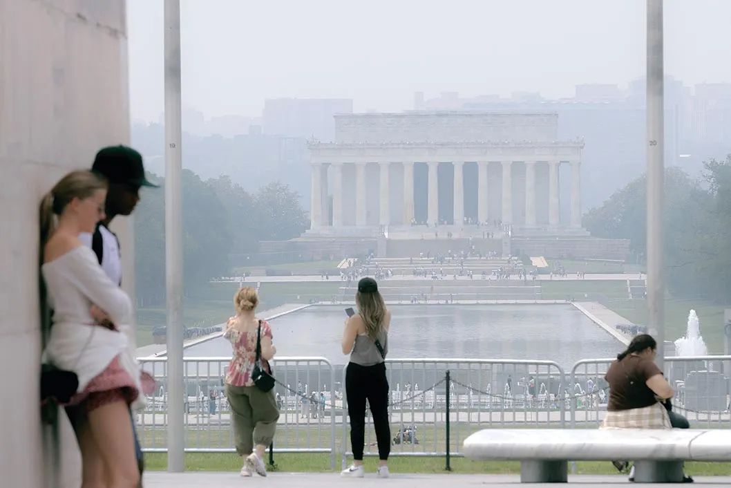 2023 年 6 月 29 日,在美国首都华盛顿,游客在华盛顿纪念碑游览,远处的林肯纪念堂笼罩在烟雾中