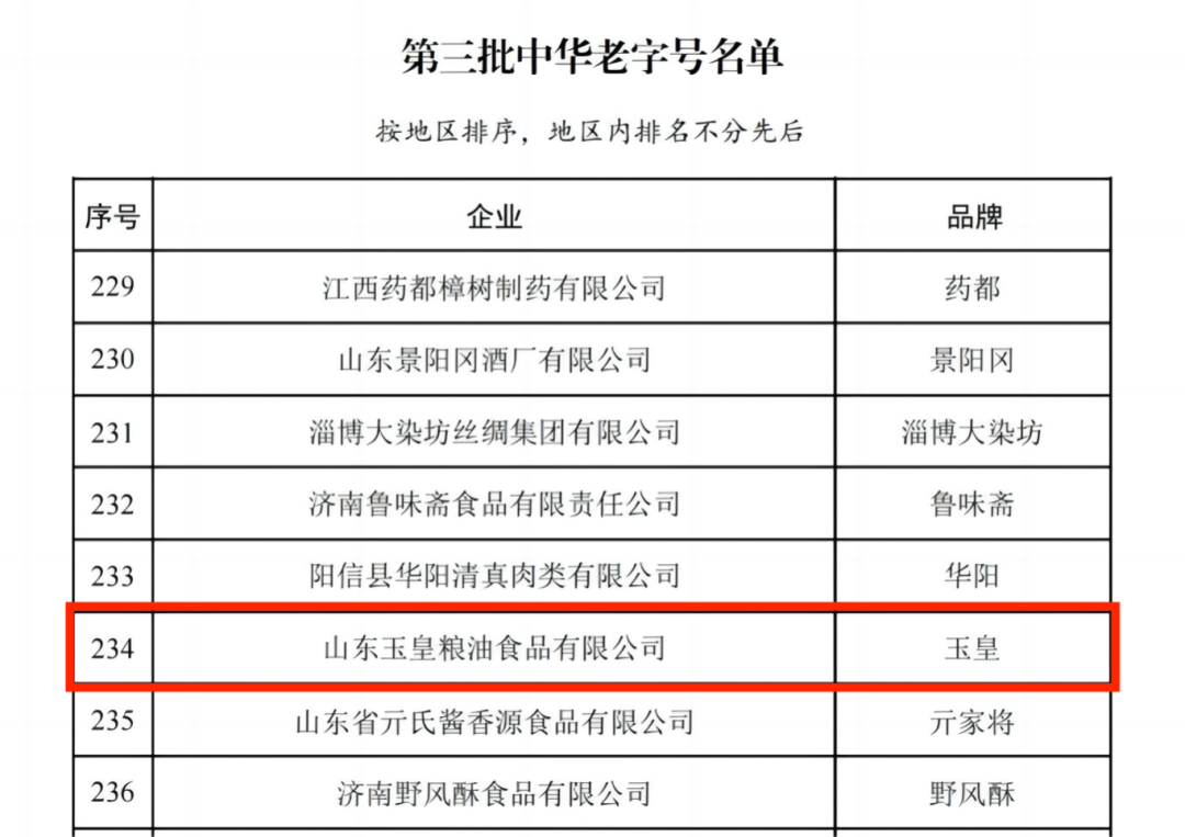 根据《中华老字号示范创建管理办法》和《商务部等5部门办公厅(室)关于开展中华老字号示范创建工作的通知》要求,商务部、文化和旅游部、市场监管总局、国家知识产权局、国家文物局等5部门坚持“优中选优”的工作原则,经企业申报、地方推荐、社会公示,商务部、文化和旅游部、市场监管总局、国家知识产权局、国家文物局决定将382个品牌认定为第三批中华老字号。2月1日,商务部网站正式公布,山东玉皇粮油食品有限公司被授予中华老字号,成为花生油行业唯一一家“中华老字号”企业。