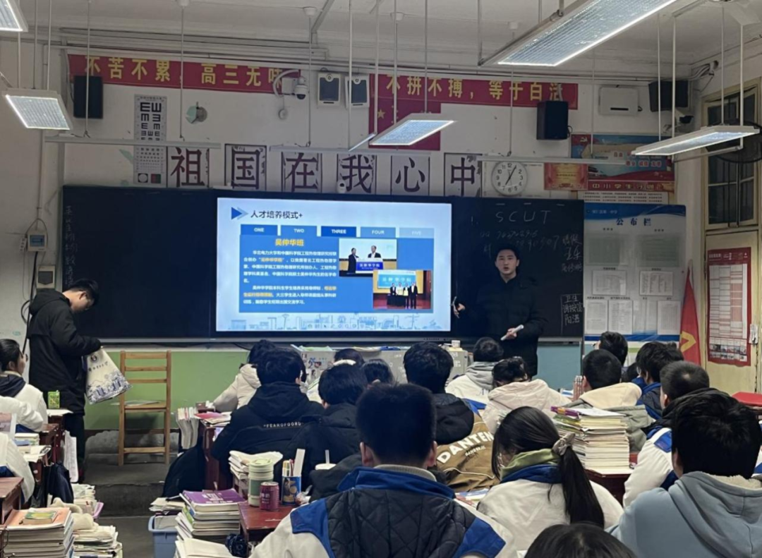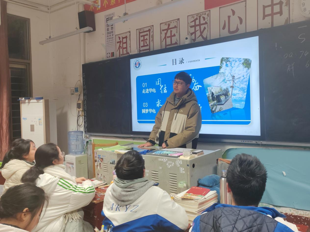 活动伊始,高三年级主任段晓东主任代表全体师生欢迎实践队并简要介绍了高三年级学生的情况。随后,谭诗意结合PPT分享了华北电力大学的校风、师资以及招生情况,让同学们对这所大学有了更深入的了解。接着,周杰详细讲解了学校的资助政策,为同学们提供了宝贵的参考信息。