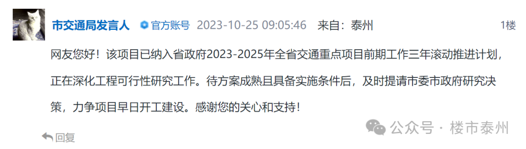 2023年10月25日,官方回复:该项目已纳入省政府2023-2025年全省交通重点项目前期工作三年滚动推进计划,正在深化工程可行性研究工作。待方案成熟且具备实施条件后,及时提请市委市政府研究决策,力争项目早日开工建设。