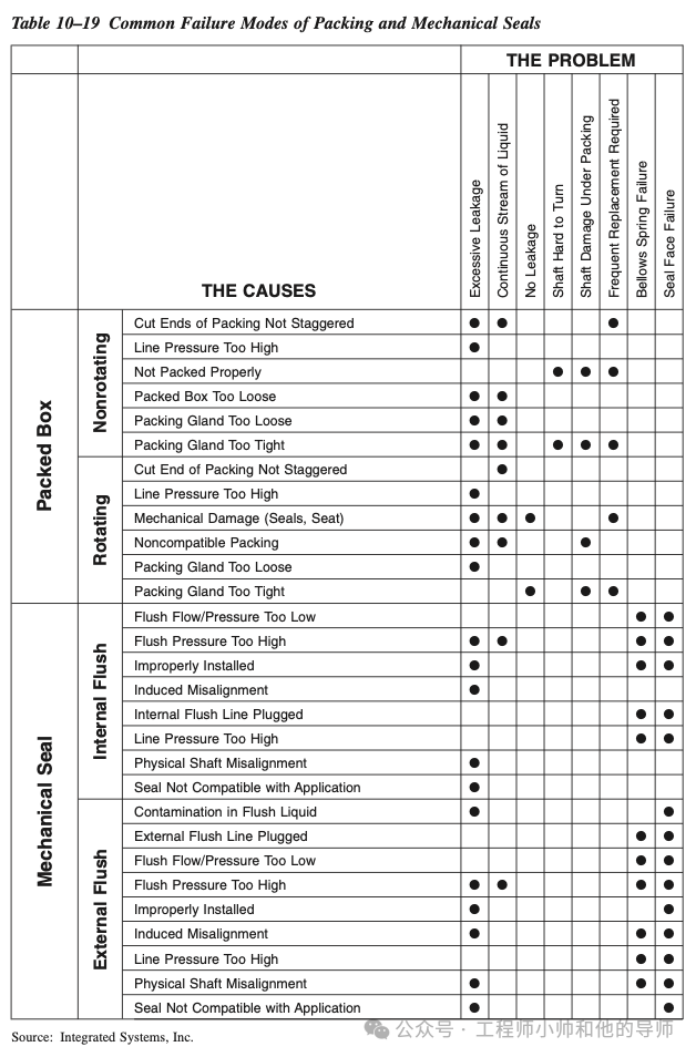 通常影响轴密封的失效模式主要包括密封过度泄漏以及机械密封或填料的过早失效。表10–19列出了机械密封和填料箱的常见失效模式。正如表中所示,这些失效模式中的大多数可以直接归因于错误的应用、不当的安装或糟糕的维护实践。