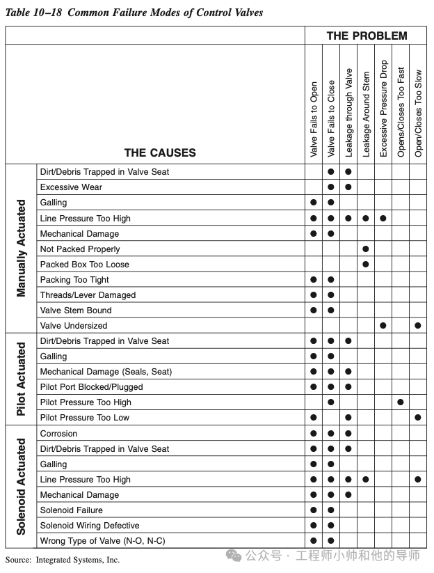 尽管存在有限的常见控制阀失效模式,但主要问题通常与泄漏、操作速度或阀门完全失效有关。表10–18列出了这些失效的更常见原因。