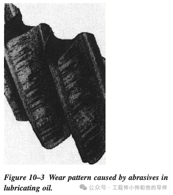 磨损会在齿轮齿上产生独特的磨损模式。该模式取决于磨损类型及其特定的作用力。图10–3说明了由润滑油中颗粒引起的严重磨损,注意到从齿根到齿尖的划痕。