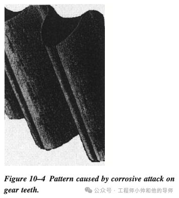 润滑油中的水和其他异物也会导致齿轮的降解和过早失效。图10–4说明了由此故障模式引起的齿轮的典型磨损模式。