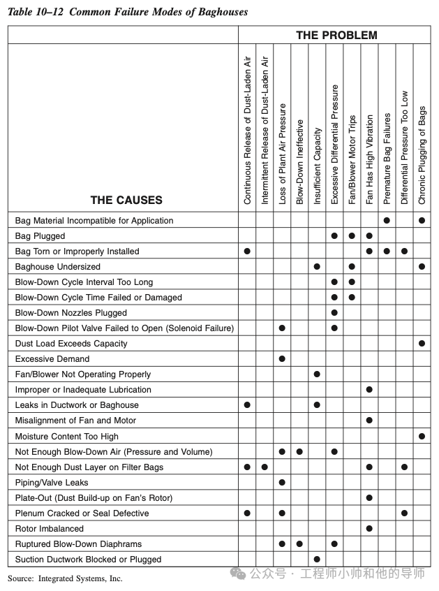 表10–12列举了袋式除尘器的常见故障模式。这个指南适用于所有使用布料滤袋作为主要除尘介质的单元。