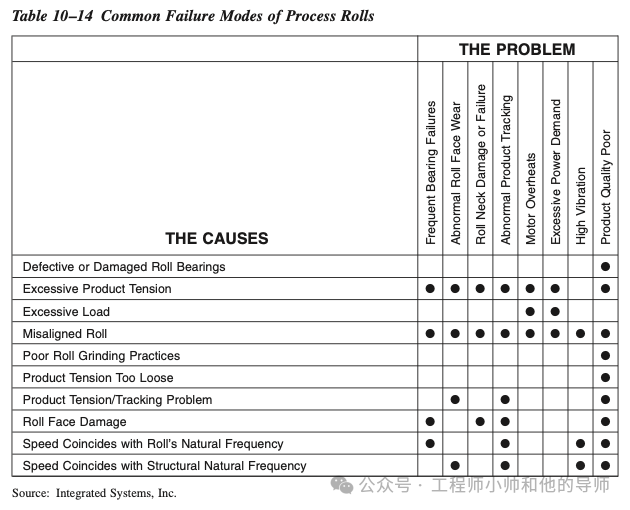 导致工艺辊可靠性问题的大多数故障通常归因于不当安装或异常感应负载。表10–14列举了工艺辊的常见故障模式及其原因。