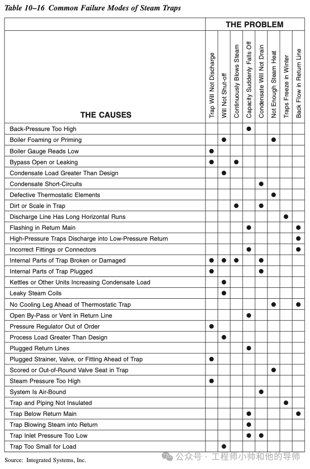 影响蒸汽疏水阀的大多数失效模式可归因于操作参数的变化或不当的维护。表10–16列出了蒸汽疏水阀失效的更常见原因。
