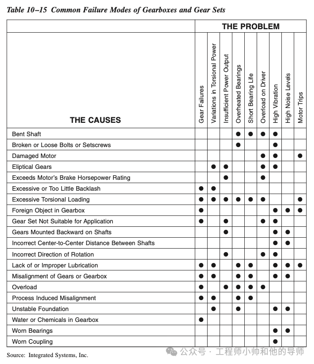 本节识别了齿轮箱(也称为减速器)的常见问题及其原因。表10–15列举了更常见的齿轮箱故障模式。故障的一个主要原因是,除了少数例外,齿轮组设计仅用于单向运转。故障通常是由于不适当的齿轮箱双向运转或齿轮组反向安装引起的。除非专门为双向运转制造,否则齿轮的“非动力”侧没有进行加工。因此,这一侧较粗糙,不能提供与完成的“动力”侧相同的公差。