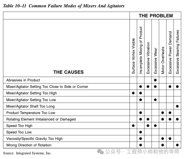 表10–11列举了搅拌器和搅拌机的常见故障模式及其原因。大多数影响性能和可靠性的问题都是由于安装不当或产品物理性质的变化引起的。