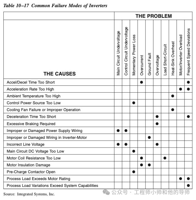 表10–17列出了变频器问题的常见症状和原因。其中大多数问题都可以归因于选择不当的特定应用。其他问题是由不当操作引起的。在评估变频器问题时,应仔细注意供应商运营和维护手册中的建议。这些建议通常在确定问题的真正根本原因方面非常有帮助。