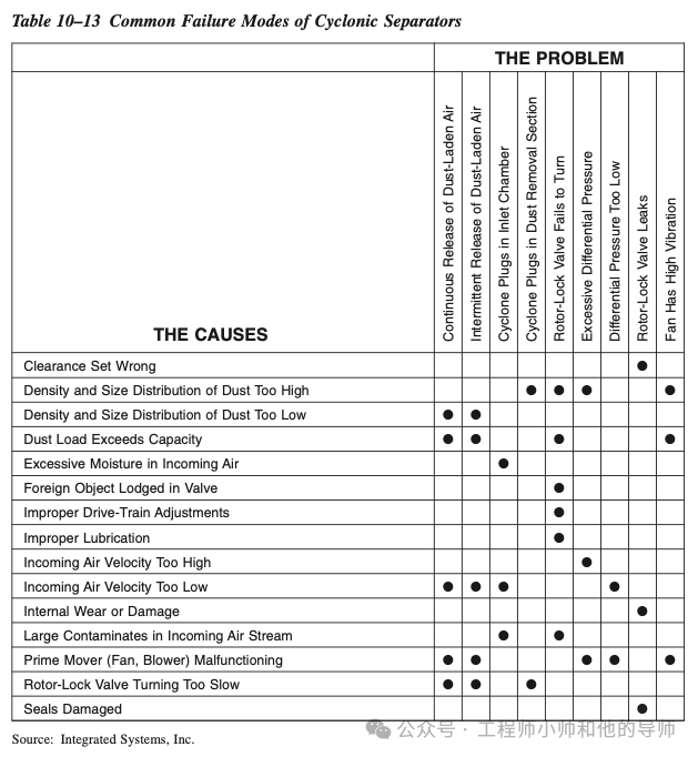 表10–13列举了旋风分离器的故障模式及其原因。由于旋风分离器内部没有运动部件,与这种类型系统相关的大多数问题可以归因于流量、尘负荷、尘埃成分(如密度、大小)和环境条件(如温度、湿度)的过程参数的变化。