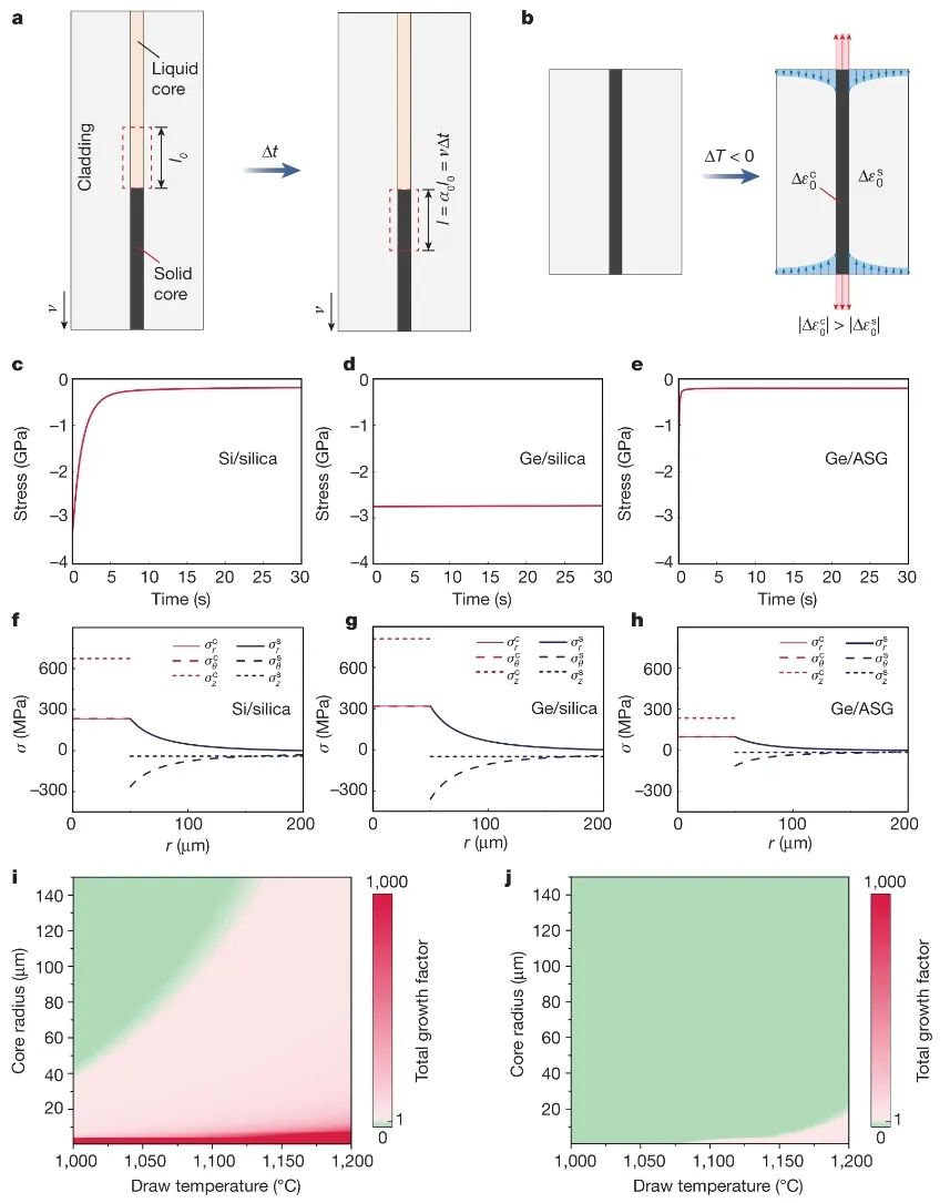 a、 显示液体半导体芯的小柱在Δt的短时间内固化的示意图。在稳态热拉伸过程中,液固界面的位置保持不变。b、 显示冷却阶段热失配的示意图。c–e,Si/二氧化硅(c)、Ge/二氧化硅(d)和Ge/ASG(e)纤维固化半导体芯中最大主应力的演变。f–h,Si/二氧化硅(f)、Ge/二氧化硅(g)和Ge/ASG(h)纤维芯和包层中应力分量的径向分布。i、 j,Ge/BSG(i)和Ge/ASG(j)纤维的总生长因子的等高线图。绿色区域表示半导体芯不受毛细管不稳定性增长影响的纤维拉伸条件。