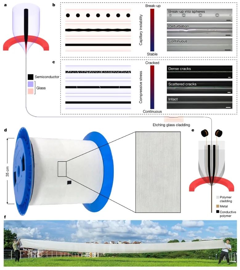 a、 熔芯法示意图。预制棒由玻璃包层(紫色)和半导体芯(黑色)制成,被拉伸到纤维尺寸。b、 纤维芯的几何形状与毛细管不稳定性的发展相对应。显示了具有不同程度毛细管不稳定性的纤维的示意图(左)和光学图像(右)。比例尺,100 μm。c、 纤维芯几何形状与不同的应力水平有关。纤维的示意图(左)和光学图像(右)显示了在制造过程中形成的应力作用下完整和开裂的纤芯。比例尺,100 μm。d、 大约一百米的连续半导体芯纤维通过一次拉丝工艺制成。玻璃包层可以通过酸蚀刻去除。e、 会聚纤维拉伸技术示意图。暴露的半导体纤维和金属丝在该过程中保持其坚固性。在颈缩区域中形成材料的紧密界面。f、 由由此产生的光电子纤维实现的大规模功能织物。