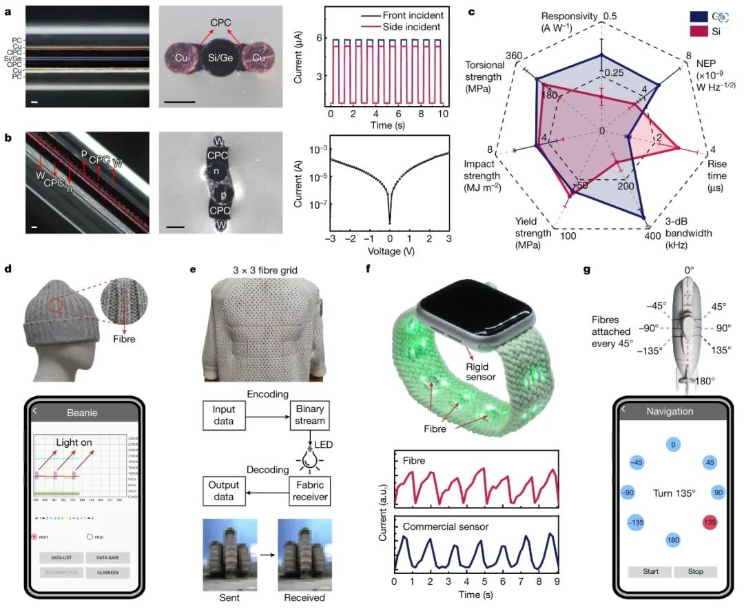 a、 左、中:单芯光电光纤。左和中:单芯光电子光纤的侧视图(左)和横截面(中)的光学图像,其中芯半导体通过一层CPC连接到每个铜电极。右图:由此产生的光电子光纤显示出伪全向响应,可保持不同方向的灵敏度。PC、聚碳酸酯。比例尺,50 μm。b、 左和中:双核p–n结光纤的侧视图(左)和横截面(中)的光学图像。右图:p–n结光纤的I–V特性。比例尺,50 μm。c、 所得光电子纤维的整体性能评估。硅光电纤维的NEP值被放大10倍以进行可视化。对于响应度和NEP的测量,n = 所有情况下为9。对于其他测量,n = 所有情况下为6。所有数据均以平均值表示 ± s.d.d,顶部:用于户外辅助穿戴设备演示的功能性无檐便帽。接口板被放置在无檐帽尖端内。底部:无檐便帽接收到的信号在移动应用程序中可视化。e、 上衣:适用于室内Li-Fi通信系统的功能性毛衣。中间:通过功能毛衣接收数据的框图。下图:一张建筑(南洋理工大学学习中心)的照片通过毛衣发送和接收。f、 上图:表带通过光电体积描记术测量心脏脉冲。传统上,刚性传感器安装在手表背面。光电子纤维被编织到表带中,将表带变成一个灵活的保形传感器。底部:光纤和商用传感器之间测量脉冲的比较。g、 上图:用于水下可见光通信系统的光纤接收器阵列。每45°将纤维保形地连接到迷你潜艇上,将迷你潜艇的圆周分为8个部分,每个纤维代表一个特定的角度。底部:当135°光纤接收到信号时,移动应用程序中的命令行显示“转动135°”。