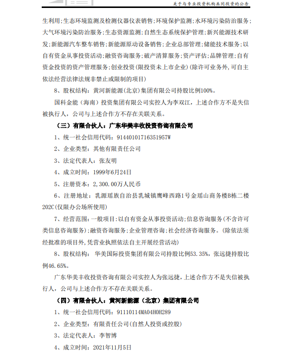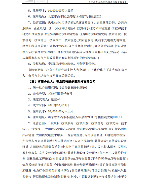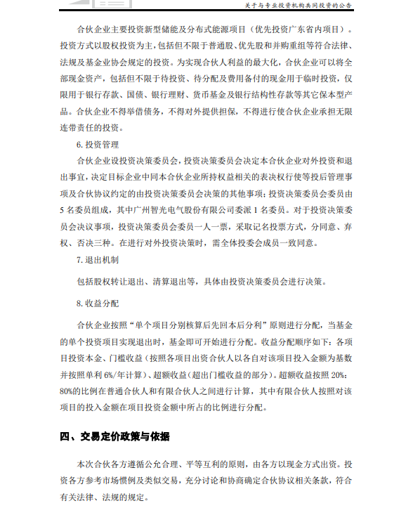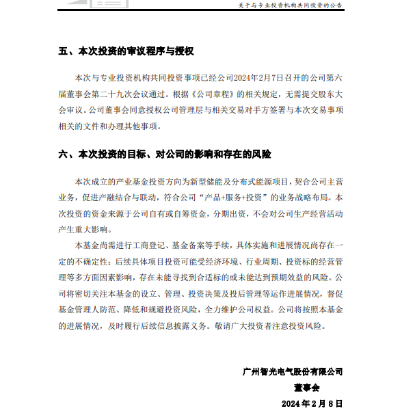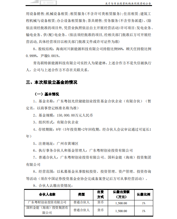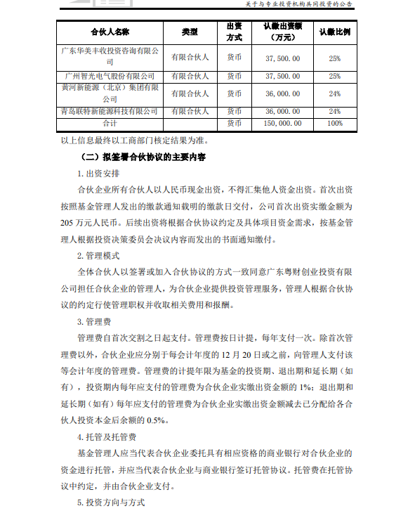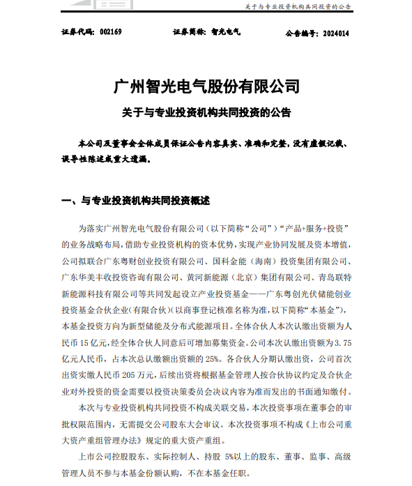 公告显示,为落实智光电气“产品+服务+投资”的业务战略布局,借助专业投资机构的资本优势,实现产业协同发展及资本增值,智光电气拟联合广东粤财创业投资有限公司、国科金能(海南)投资集团有限公司、广东华美丰收投资咨询有限公司、黄河新能源(北京)集团有限公司、青岛联特新能源科技有限公司等共同发起设立产业投资基金——广东粤创光伏储能创业投资基金合伙企业(有限合伙)。