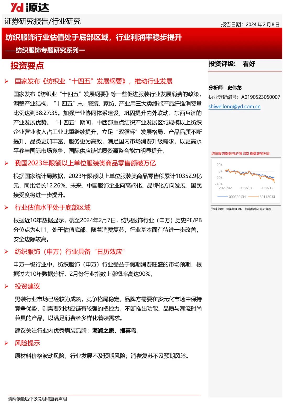 纺织服饰专题研究系列一:纺织服饰行业估值处于底部区域,行业利润率稳步提升