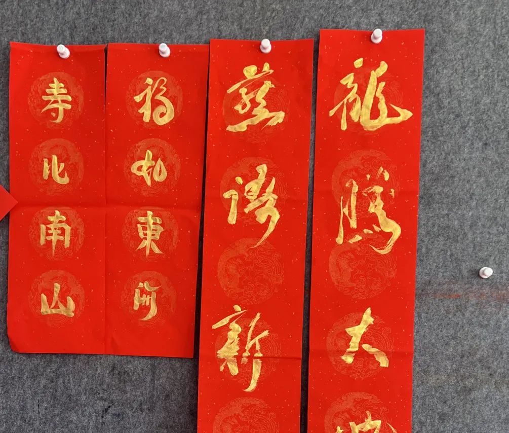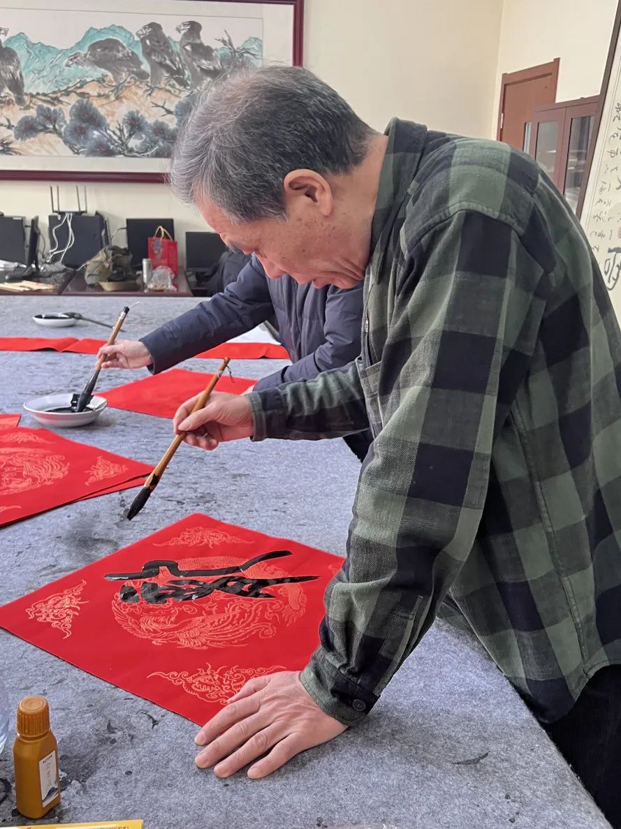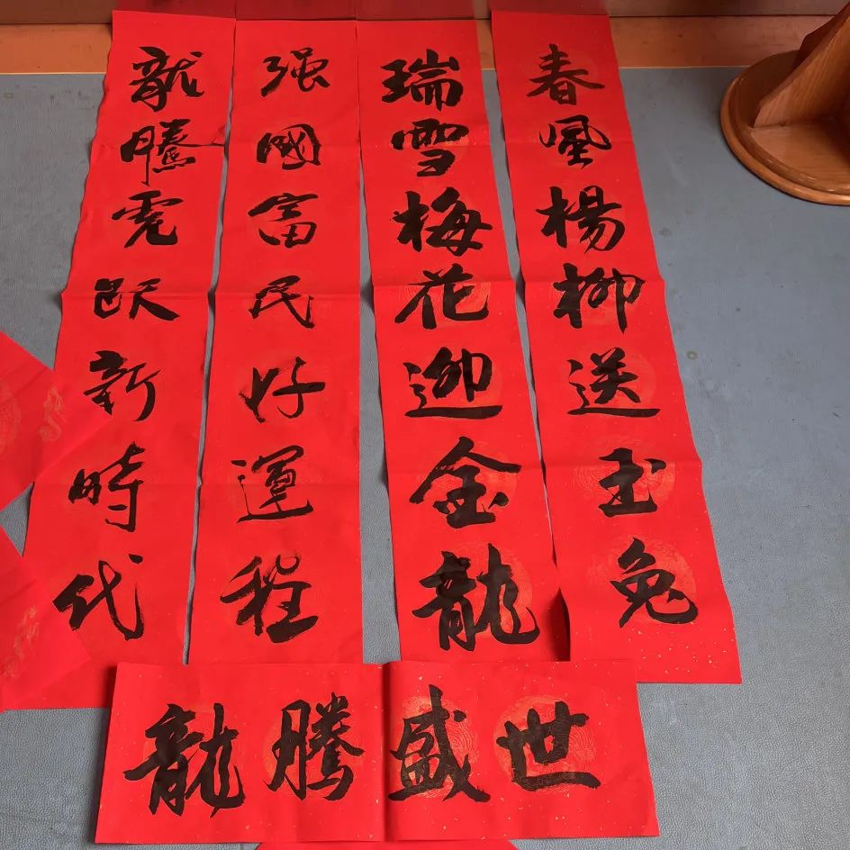 活动于上午九点正式开始,小区内众多书法爱好者纷纷来到活动现场,大家铺开红纸,饱蘸浓墨,笔走龙蛇,将新春的祝福化作一幅幅寓意吉祥的春联和福字,“五福常临积善家,吉星永照平安宅”“春风杨柳送玉兔,瑞雪梅花迎金龙”……一幅幅承载着美好祝愿的春联和福字在业主们的笔下一气呵成,现场的氛围愈发喜庆。