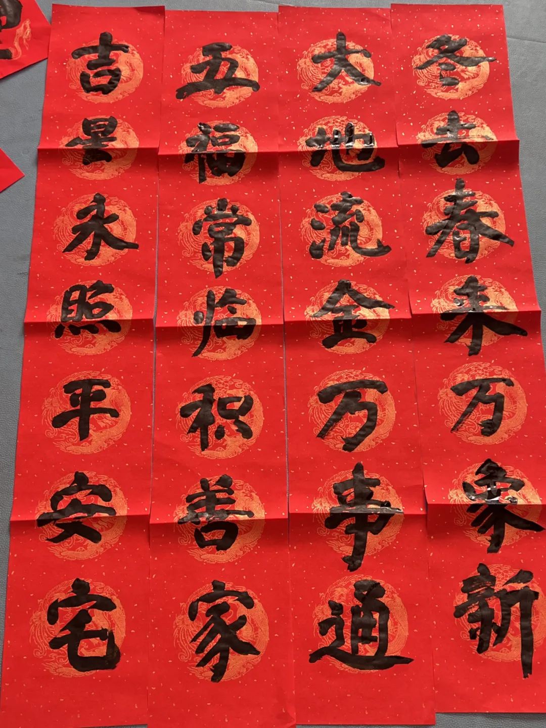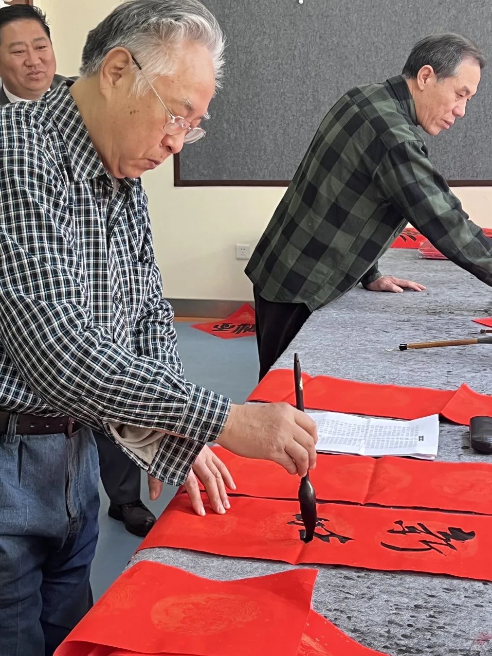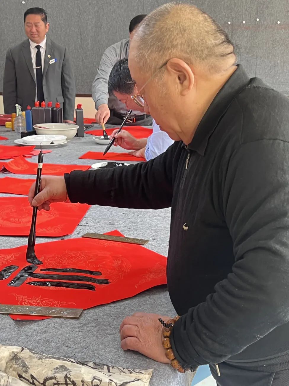 活动于上午九点正式开始,小区内众多书法爱好者纷纷来到活动现场,大家铺开红纸,饱蘸浓墨,笔走龙蛇,将新春的祝福化作一幅幅寓意吉祥的春联和福字,“五福常临积善家,吉星永照平安宅”“春风杨柳送玉兔,瑞雪梅花迎金龙”……一幅幅承载着美好祝愿的春联和福字在业主们的笔下一气呵成,现场的氛围愈发喜庆。